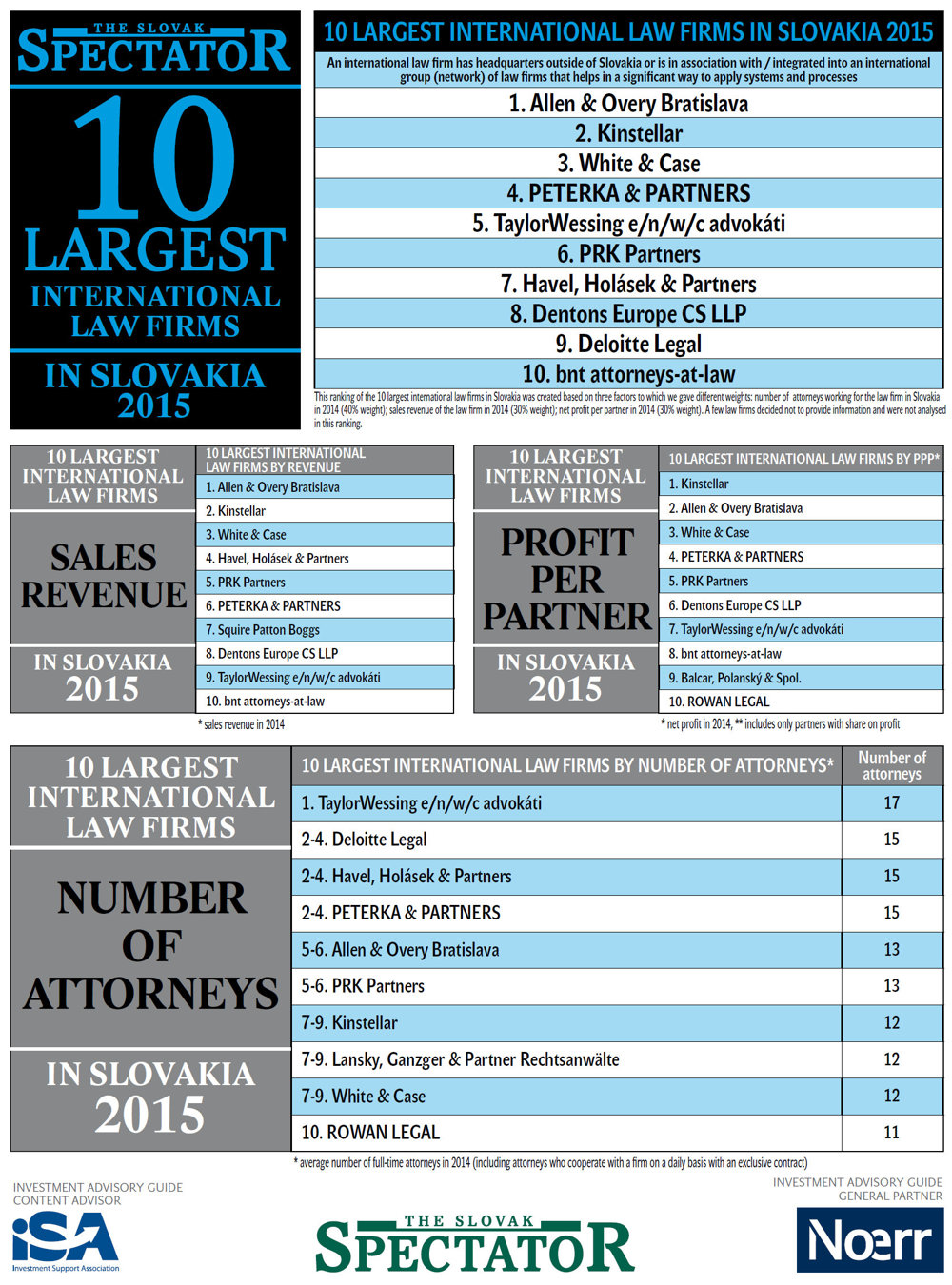 The Slovak Spectator každoročne vydáva ročenku v anglickom jazyku o podnikateľskom prostredí na Slovensku s názvom Investment Advisory Guide 2015/2016. Súčasťou tohtoročného vydania ročenky je Rebríček 10 NAJVÄČŠÍCH ADVOKÁTSKYCH KANCELÁRII NA SLOVENSKU, zoznam NAJVÝZNAMNEJŠÍCH advokátskych kancelárii na Slovensku a TOP DEALOV.